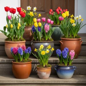Tulips, daffodils, and hyacinths in pots on either side of the door create a cheerful, welcoming atmosphere.