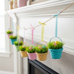 Tiny baskets filled with faux grass or miniature eggs create a whimsical Easter garland.