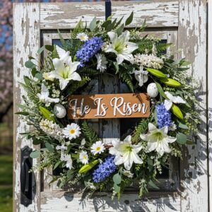 A scripture-based wreath featuring “He Is Risen” is uplifting and powerful.