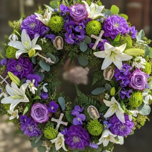 This wreath uses symbolic colors—purple for royalty, white for purity, and green for new life.