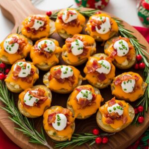 Mini potato bites topped with cheese, bacon, and sour cream — perfect finger food for NYE.