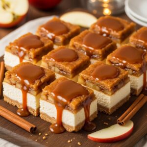 Creamy cheesecake layered with cinnamon apples and drizzled with caramel.