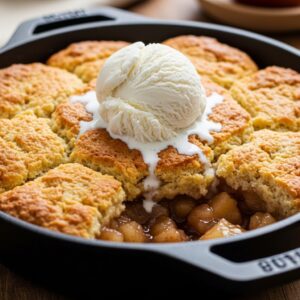 Warm cinnamon apples baked under a sweet maple biscuit topping.