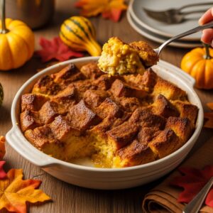 Warm bread pudding baked with pumpkin custard and fall spices.