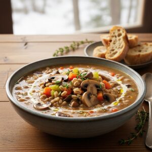Earthy mushrooms and pearled barley make a thick, cozy soup that feels grounded and nourishing.