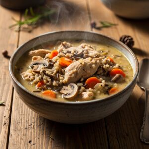 This cozy soup combines tender chicken, earthy wild rice, carrots, mushrooms, and a creamy broth.