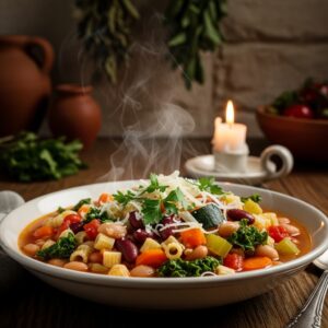 Packed with beans, pasta, tomatoes, and winter vegetables, this Italian soup is hearty and beautifully colorful.