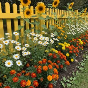 Pair it with vibrant flowers like sunflowers, daisies, or marigolds for a sunny, welcoming atmosphere.