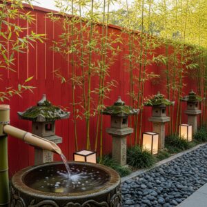 If you want to evoke a traditional Asian-inspired garden, pair red fencing with bamboo, stone lanterns, and water features.