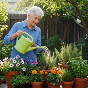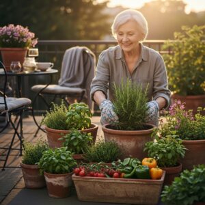 Seniors can grow herbs, flowers, or small vegetables like tomatoes and peppers in containers.