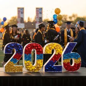 Large 3D numbers representing the graduation year make a bold statement.