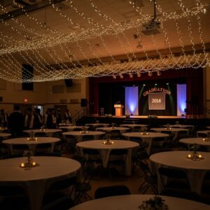 Soft string lights can add warmth and elegance to the graduation venue.