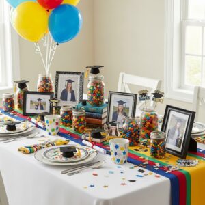 Adding a backdrop with the graduate’s photo or school colors can tie the theme together beautifully.