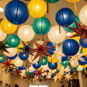 You can mix round, oval, and star-shaped lanterns to create a layered, dynamic look that draws the eye upwards.