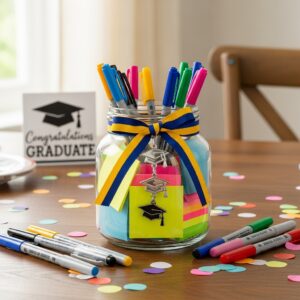 Decorate the jar with ribbons, glitter, and small charms that match the graduation theme.