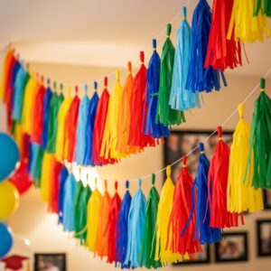 They can match the school colors or the overall party theme, giving the space a vibrant and festive feel without relying on balloons.