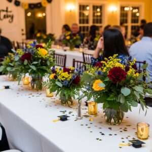 Incorporating the graduate’s favorite flowers or school colors into the arrangements can make them even more personal and festive.