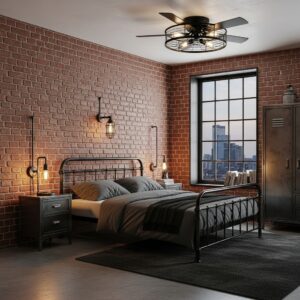 Use exposed brick walls, metal bed frames, and darker tones like charcoal, navy, and deep brown.