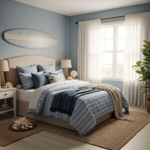 Add surfboard art or ocean prints, and use sheer curtains to mimic coastal light.