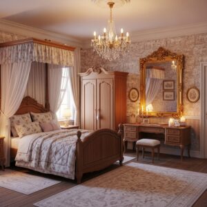 For a timeless feel, go vintage with antique furniture, floral bedding, and gold-framed mirrors.