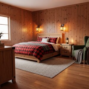 Use wooden panel walls, lantern-style lighting, and cozy flannel bedding.