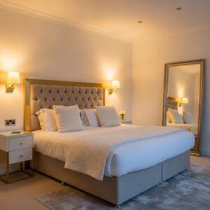 Use plush bedding, gold accents, elegant lamps, and a soft area rug to create a sense of luxury.