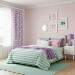 Add matching cushions, curtains, and a pastel rug to tie everything together.