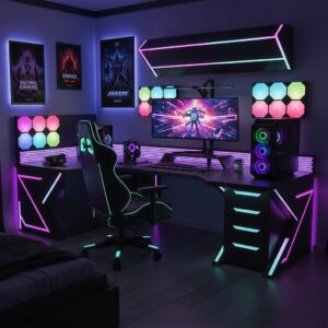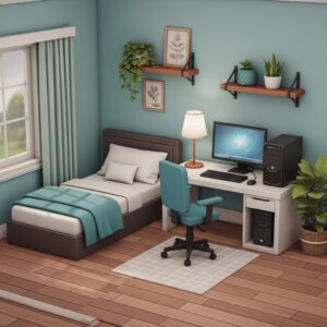 Add posters, LED strips, and a desk setup to make it feel energetic.