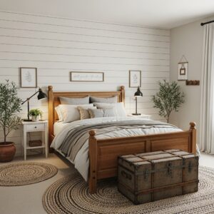Include soft bedding, farmhouse lamps, and greenery for a welcoming touch.
