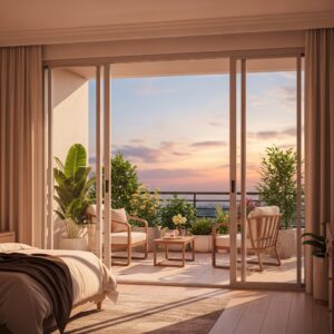 Add sliding glass doors, a few plants outside, and cozy outdoor seating.
