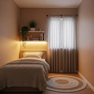 Choose light-colored walls to make it appear larger and add layered textures—like a knitted blanket or a soft carpet—to make it feel cozy.
