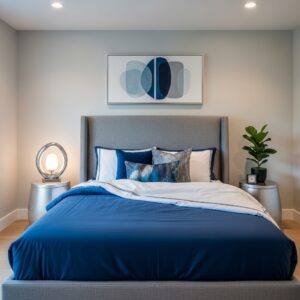 Add a gray upholstered headboard, blue bedding, and minimalist wall art.