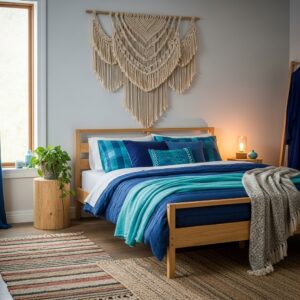 Add a relaxed and artistic feel with patterned blue textiles, macramé wall hangings, and natural wood furniture.