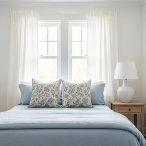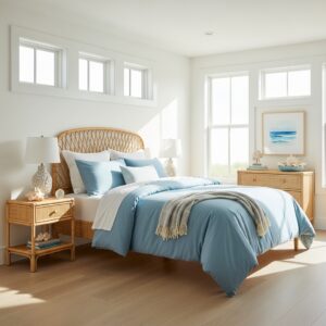 Pair crisp white bedding with sky-blue throw pillows, woven textures, and a few coastal accents like seashell decor or driftwood frames.