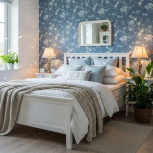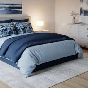 Let your bedding be the centerpiece. Mix different blue tones — navy duvet, light blue sheets, and patterned pillows — to create depth and interest.