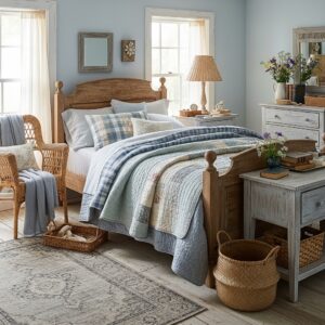 Add cozy quilts, wicker baskets, and antique mirrors to complete the look.