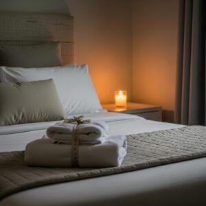 Finish your simple guest room with thoughtful details—like a folded towel set, a scented candle, or a small basket with toiletries.