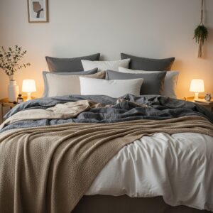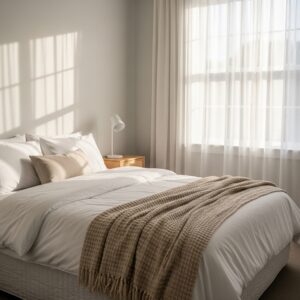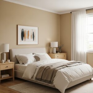 Choose shades like beige, white, gray, or light taupe for the walls and bedding.