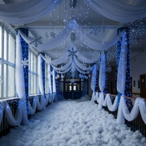 Transform the school entrance into a winter wonderland with white drapes, snowflake cutouts, cotton batting for snow, and a blue LED light glow.