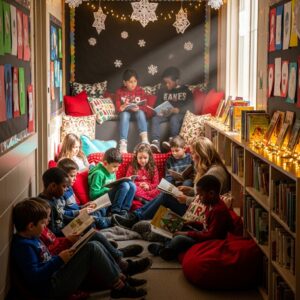 Set up a cozy reading nook in a wide hallway area with bean bags, Christmas storybooks, pillows, paper trees, and string lights.