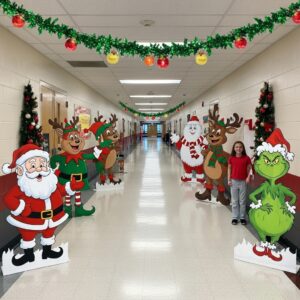 Place large cutouts of characters like Santa, elves, reindeer, Frosty the Snowman, and the Grinch along the hallway.