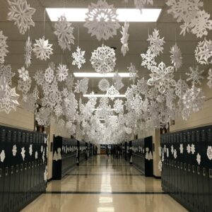 Have students create paper snowflakes in art class, then hang them from the hallway ceiling using clear fishing line.
