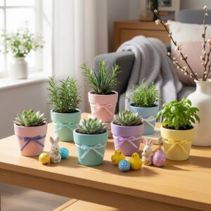 Tiny potted plants like succulents or herbs add life to your Easter display.