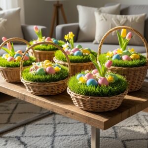 Wicker or rattan baskets filled with faux grass, flowers, or eggs are timeless Easter decorations.