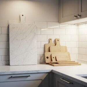 Modern kitchens often feature cutting boards that sit upright against the backsplash, creating a visual statement.