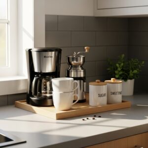 Include essentials like a coffee maker, grinder, mugs, and sugar canisters.