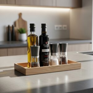 Use it to group accessories like oils, vinegar, salt, and pepper, creating an organized, visually appealing cluster.