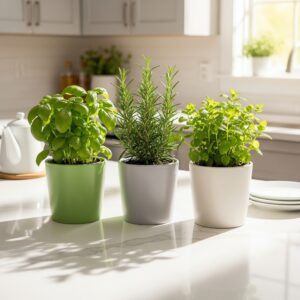 Small countertop planters with basil, rosemary, or mint bring greenery indoors.