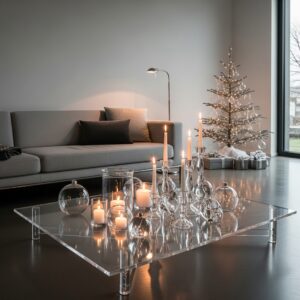 Incorporate clear acrylic or glass ornaments, trays, or candleholders to maintain an airy, uncluttered look.