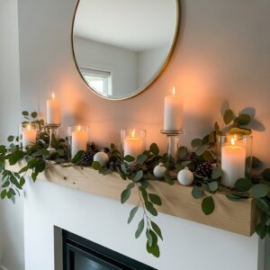 Use eucalyptus branches, pine clippings, and white candles in glass holders along your TV stand or mantel.